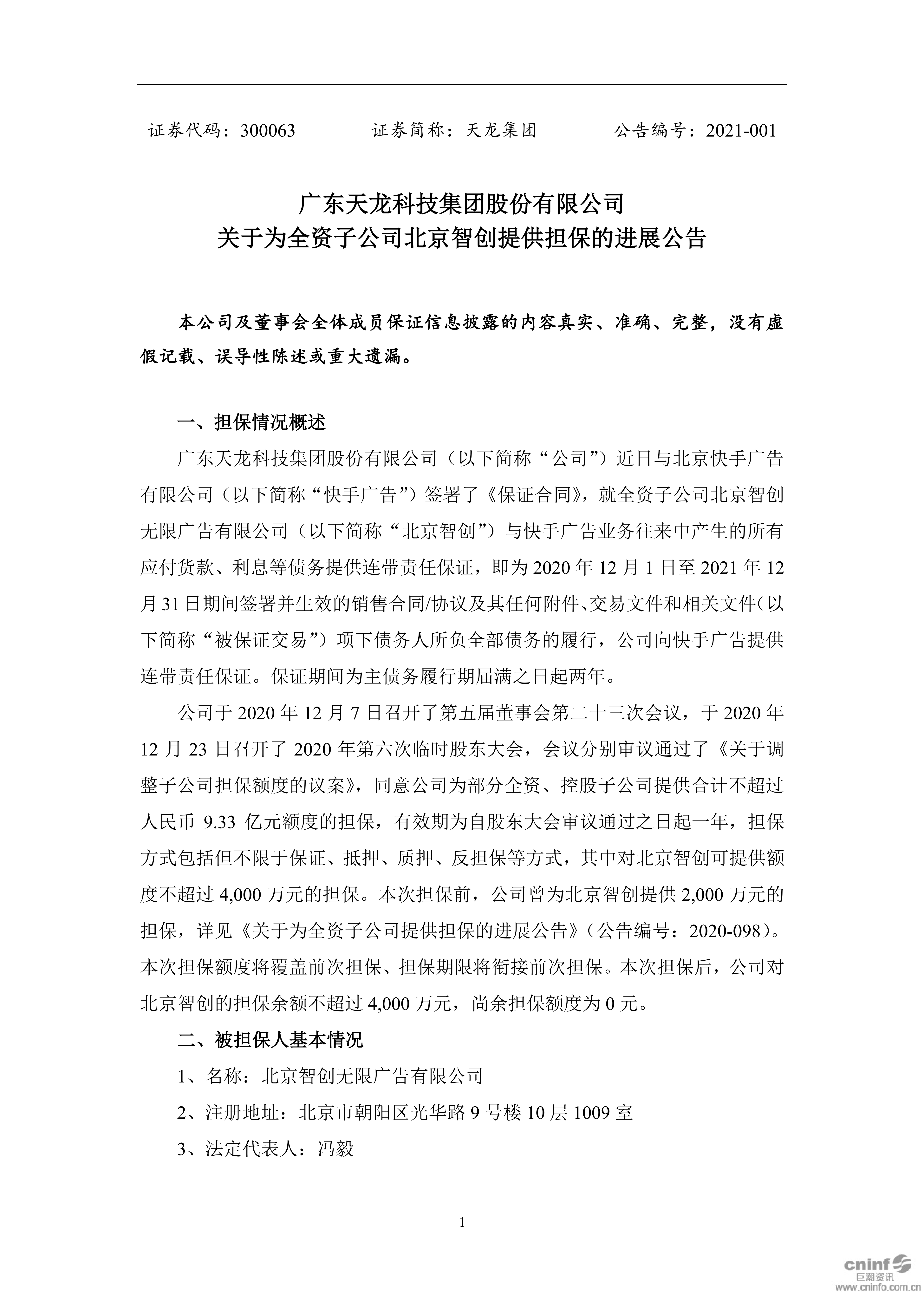 天龍集團:關于為全資子公司北京智創提供擔保的進展公告