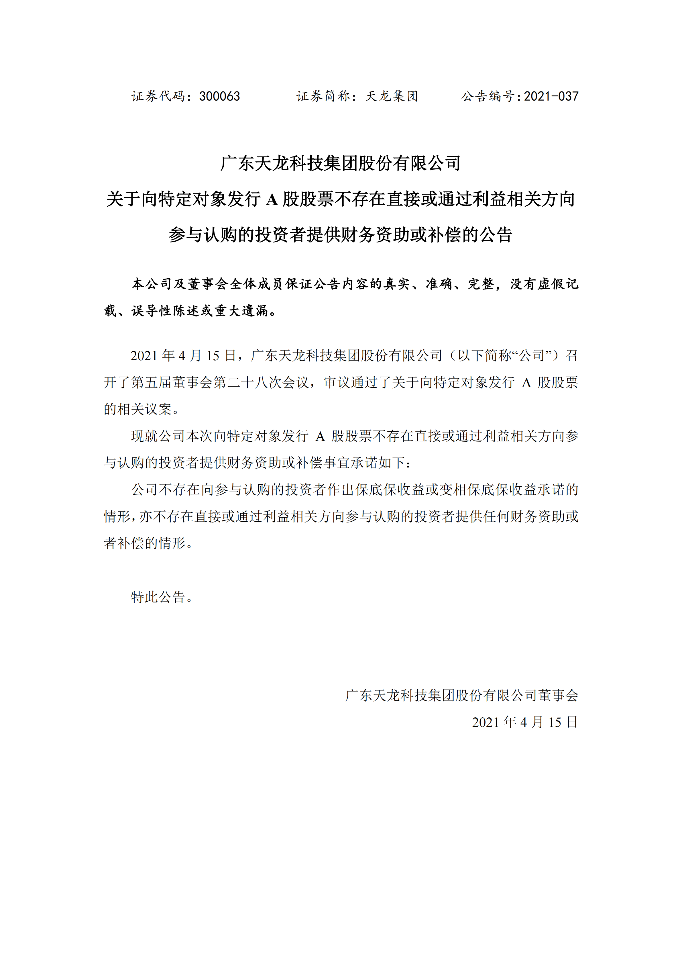 廣東天龍科技集團股份有限公司關于向特定對象發行A股股票不存在直接或通過利益相關方向參與認購的投資者提供財務資助或補償的公告