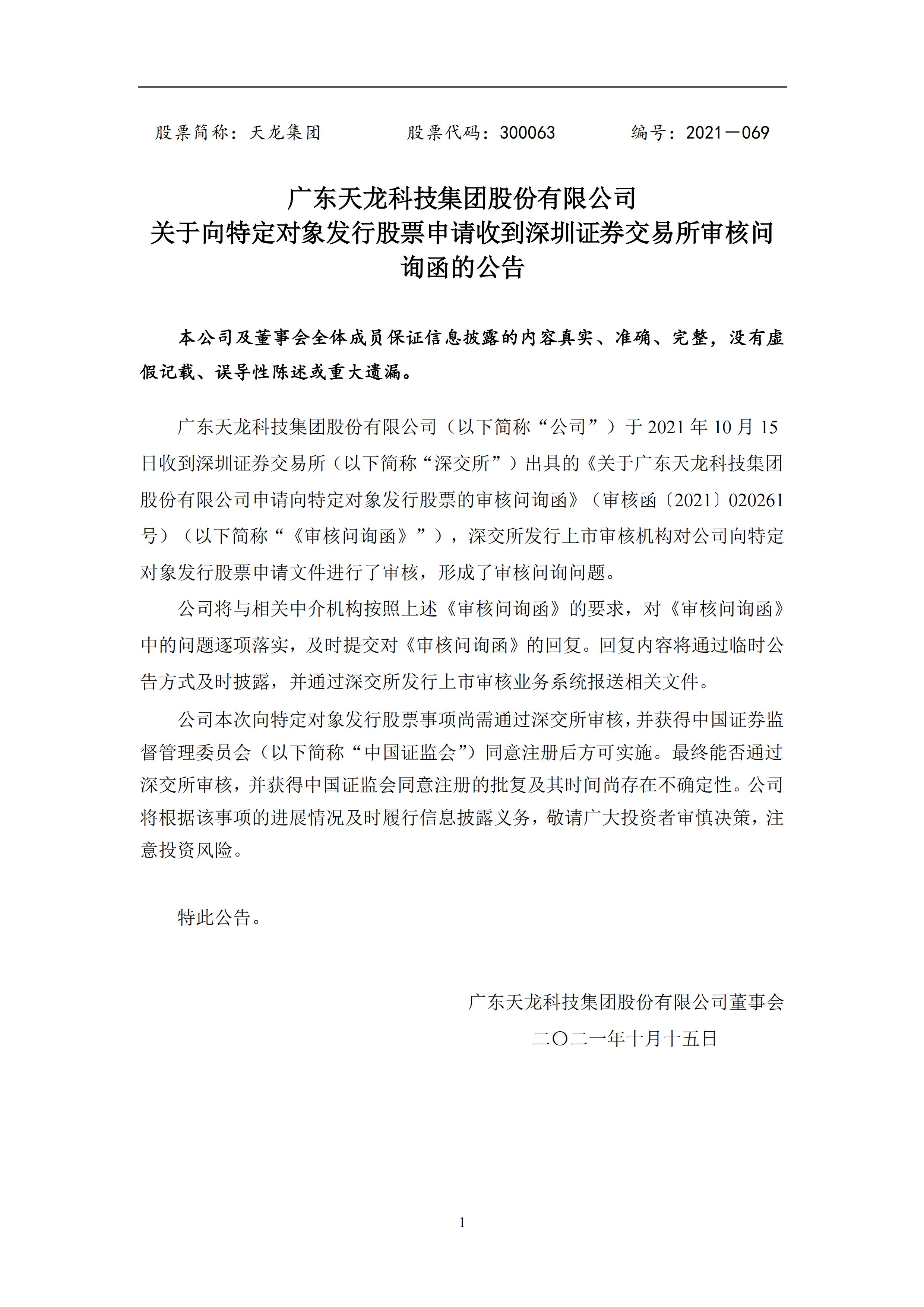關于向特定對象發行股票申請收到深圳證券交易所審核問詢函的公告