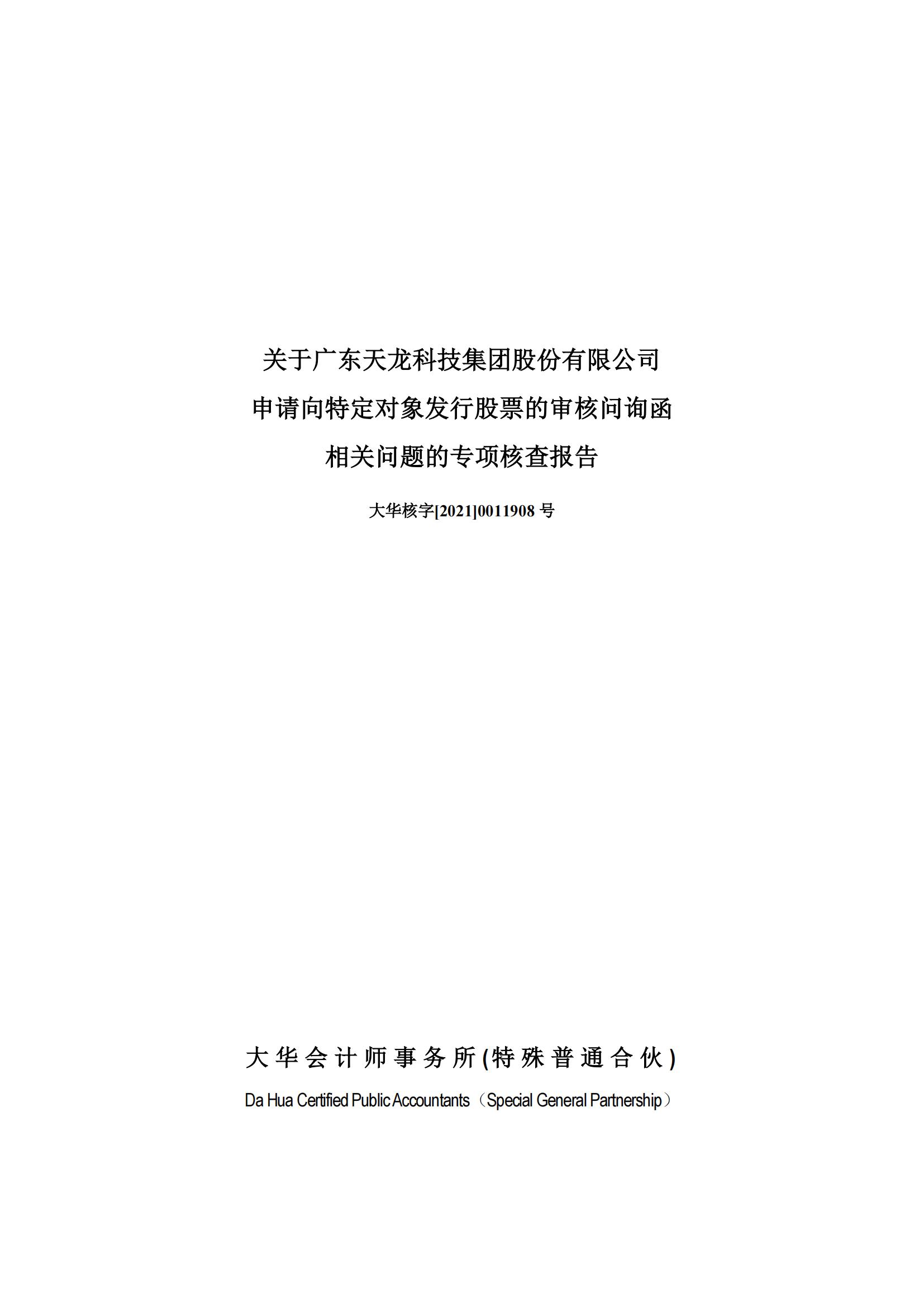 大華會計師事務所關于廣東天龍科技集團股份有限公司申請向特定對象發行股票的審核問詢函相關問題的專項核查報告