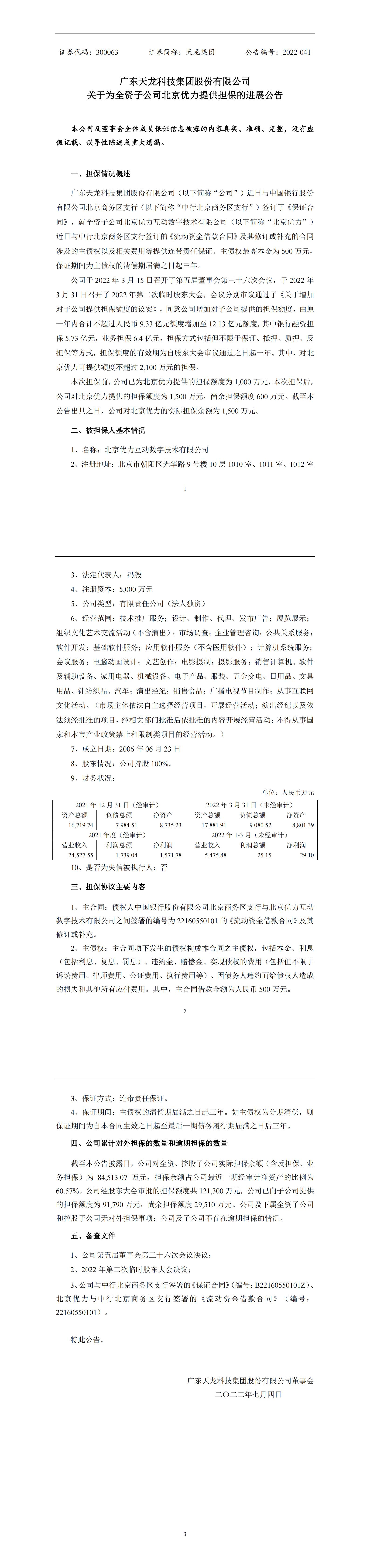 關于為全資子公司北京優力提供擔保的進展公告