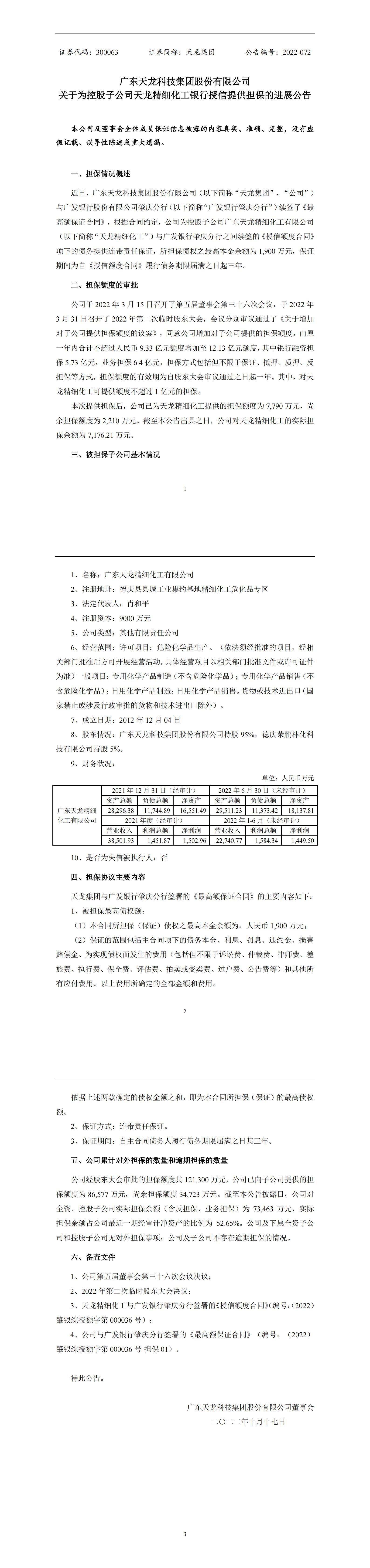 關于為控股子公司天龍精細化工銀行授信提供擔保的進展公告