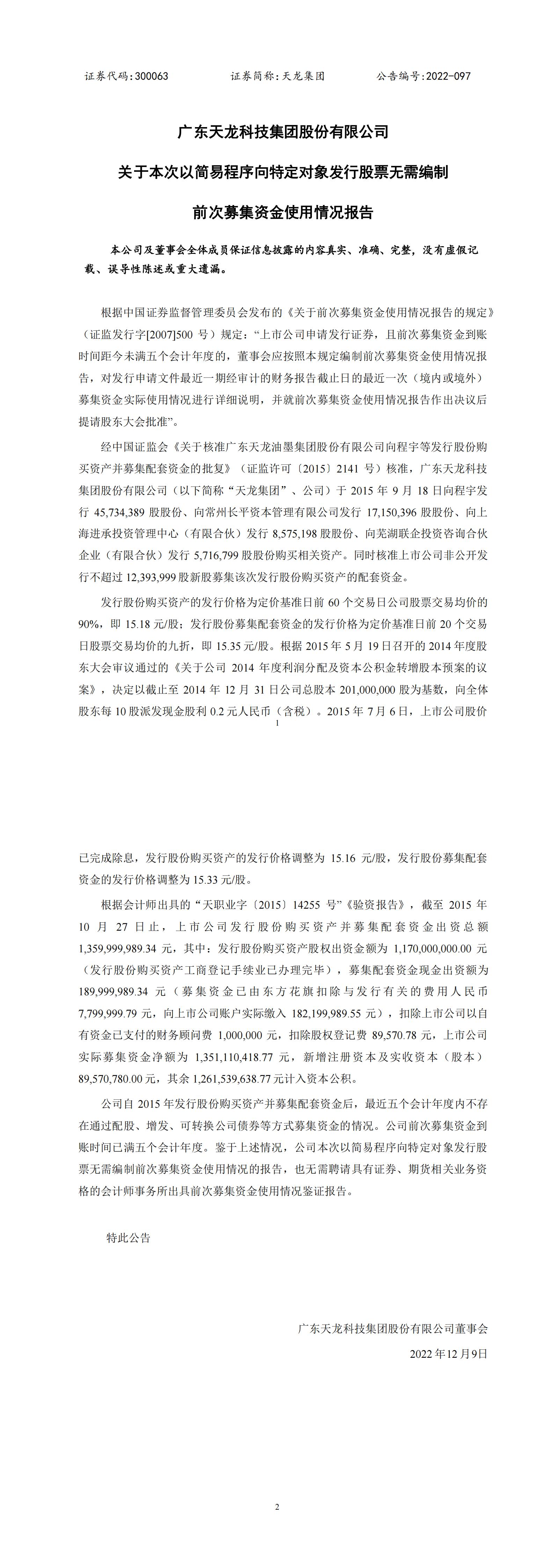 廣東天龍科技集團股份有限公司關于本次以簡易程序向特定對象發行股票無需編制前次募集資金使用情況報告的公告
