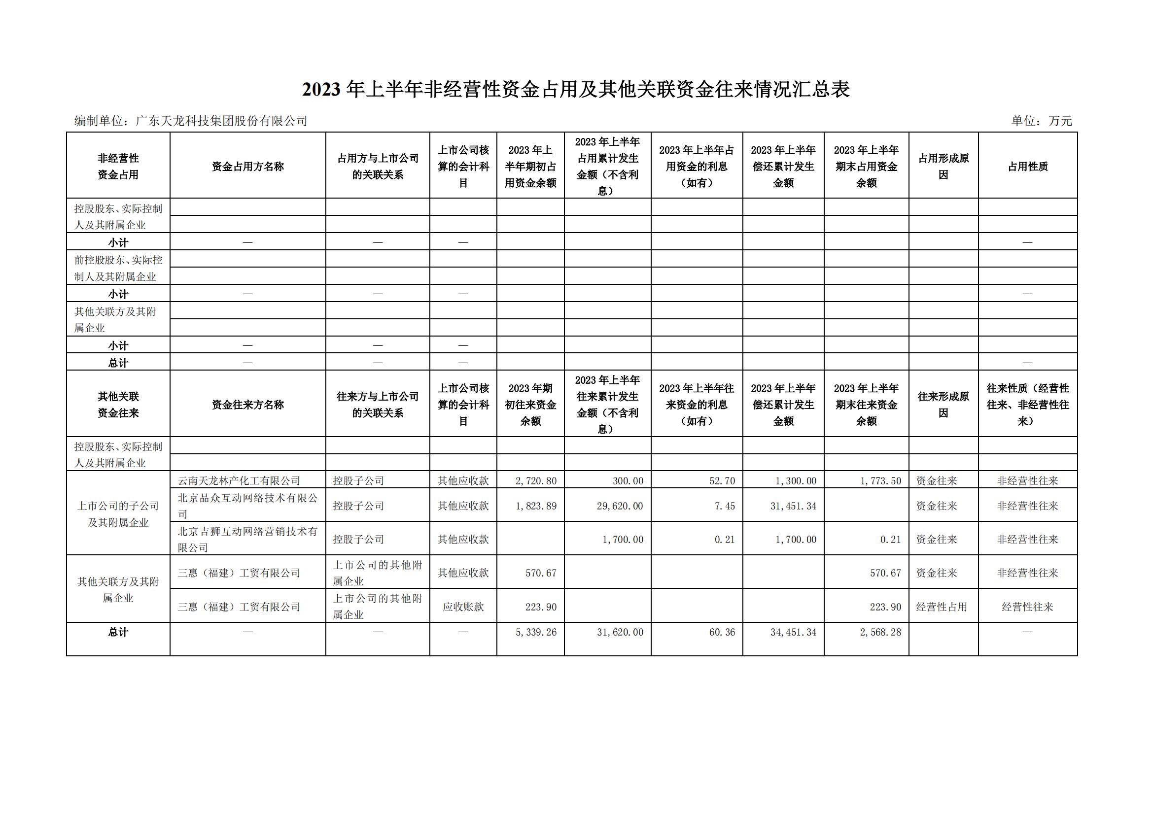 2023年上半年非經營性資金占用及其他關聯資金往來情況匯總表