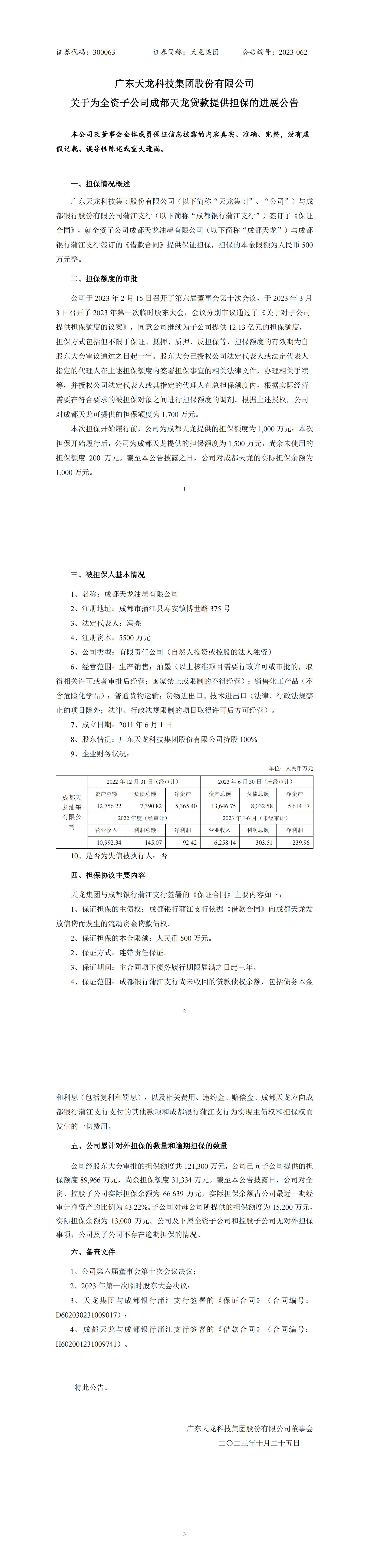 關于為全資子公司成都天龍貸款提供擔保的進展公告