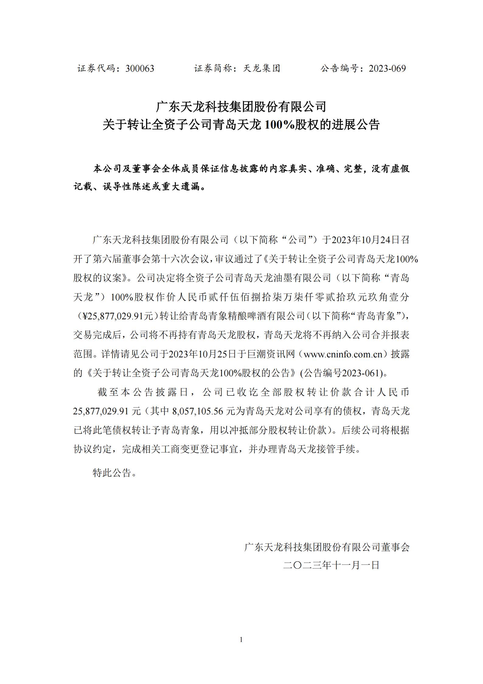 關于轉讓全資子公司青島天龍100%股權的進展公告