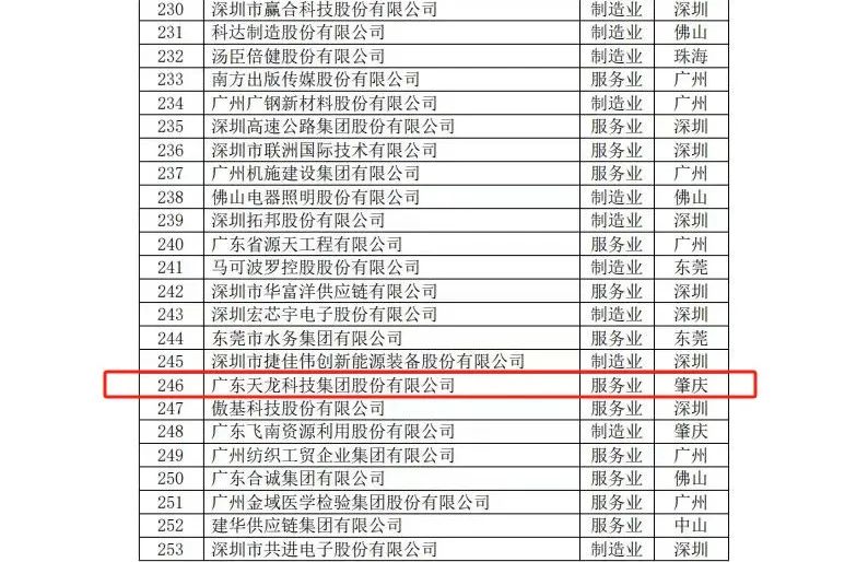 廣東天龍科技集團股份有限公司(排名246位)