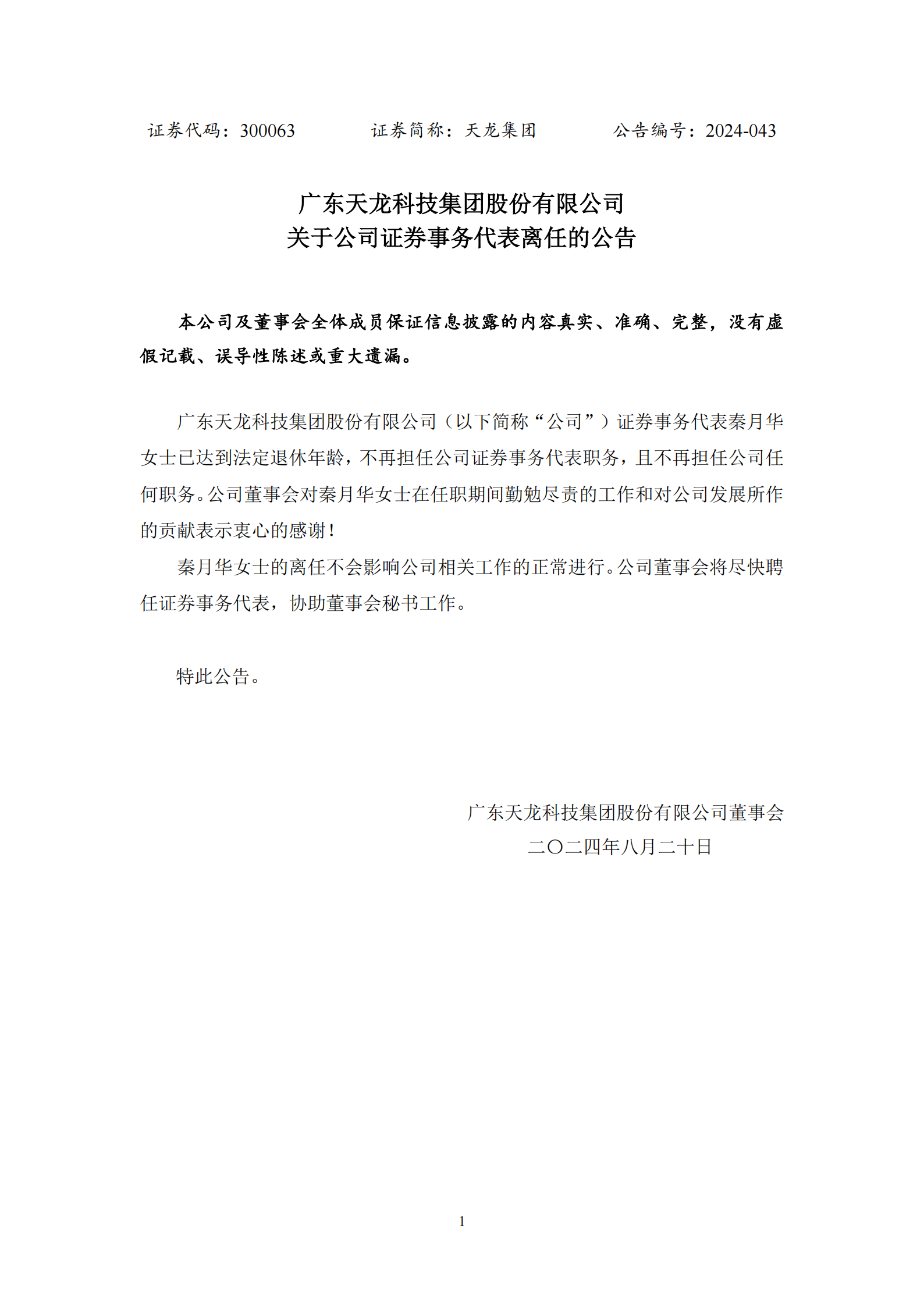 關于公司證券事務代表離任的公告