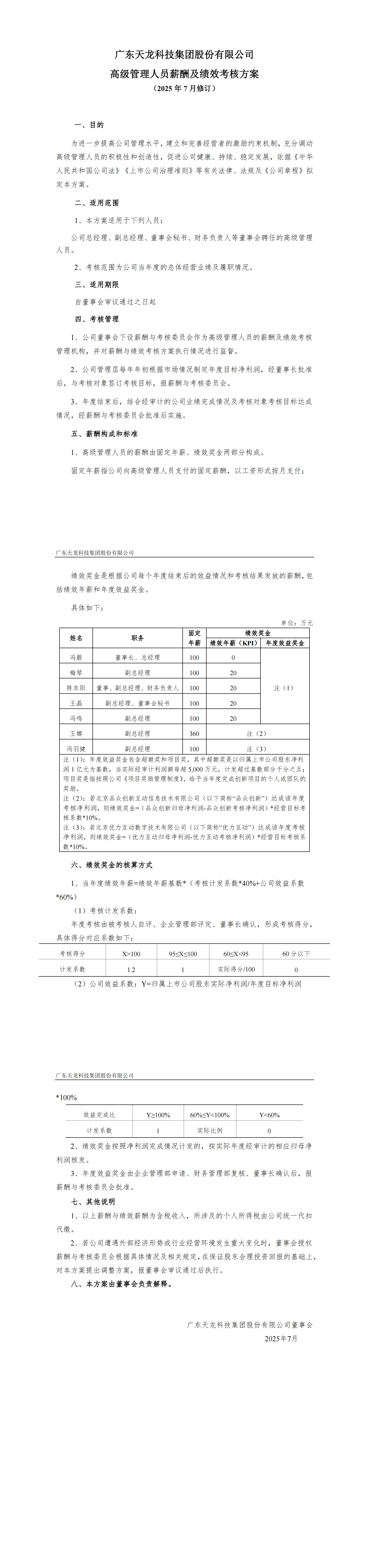 廣東天龍科技集團股份有限公司高級管理人員薪酬及績效考核方案(2025年7月)